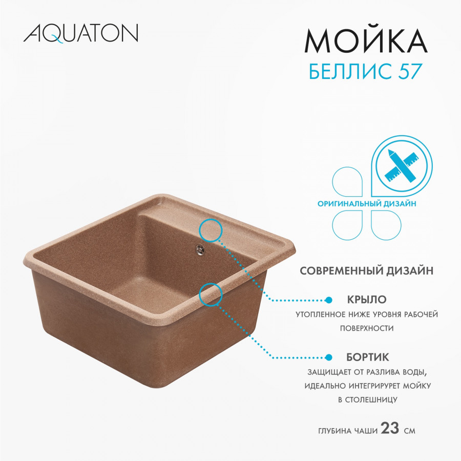 Новая серия кухонных моек из литого мрамора AQUATON БЕЛЛИС: урбанистический характер и максимальная функциональность. Современная кухня должна отвечать самым высоким требованиям: быть практичной, долговечной, безопасной и максимально функциональной, чтобы каждый день в заботе о близких вы ощущали преимущества инновационных технологий. AQUATON представляет новую коллекцию кухонных моек БЕЛЛИС из литого мрамора с ультрамодным урбанистическим дизайном, который идеально дополнит вашу кухню. Уникальный дизайн, навеянный новыми трендами Запада, делает новую серию кухонных моек Беллис не только безупречно красивой, но и очень функциональной. Увеличенная глубина чаши, утопленное ниже уровня рабочей поверхности крыло и защищающий от разлива воды бортик идеально интегрируют мойку в столешницу, создавая ощущение единого целого. Серия представлена в четырёх популярных размерах - 57, 78, 87 и 97 см. На выбор 9 цветовых решений, которые подчеркнут ваш индивидуальный стиль и преобразят интерьер: графит, песочный, серый, жемчуг, серый шёлк, латте, терракот, кофе и шампань. Модели разработаны с увеличенной глубиной чаши и дополнены новым аксессуаром - разделочной доской из дуба, которая сделает мойку еще более функциональной и позволит увеличить размер рабочей поверхности, обеспечивая устойчивую износостойкую основу для резки. Практичный и простой в уходе дуб — натуральный материал, который сделает вашу кухню ярче и уютнее! Благодаря идеально гладкой поверхности и отсутствию микропор кухонные мойки AQUATON БЕЛЛИС невероятно приятны на ощупь и имеют высокие антибактериальные свойства, за ними легко ухаживать. Изделия серии обладают длительным сроком службы: гарантия на мойки составляет 5 лет, а срок эксплуатации не менее 10 лет!