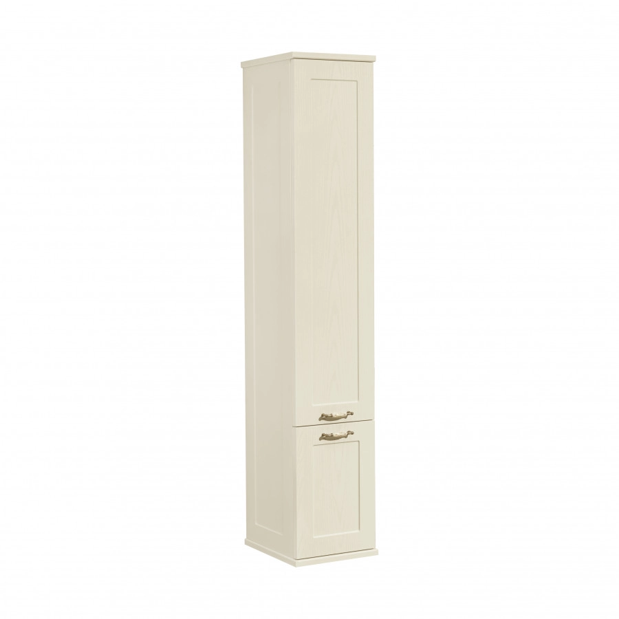 Подвесной шкаф-колонна Леон выполнен в классическом стиле в теплом цвете дуб бежевый из высококачественной МДФ, оснащен изящной фурнитурой с цветочным орнаментом и имеет матовое влагостойкое покрытие. За верхним фасадом располагаются полки, на которых удобно разметить необходимые в ванной комнате принадлежности, в нижней части шкафа расположена бельевая корзина-функциональная деталь, незаменимая в ванной комнате. Данный шкаф может быть как в левом, так и в правом исполнении, а поскольку его петли оснащены механизмом плавного довода, это обеспечивает мягкое и бесшумное закрывание дверок.