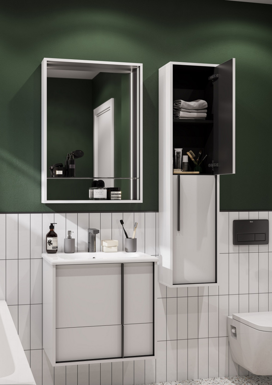 Корпус шкафа-колонны выполнен из черной МДФ в белой пленке, что позволяет создать яркий контраст черного и белого. Пленка позволяет надежно защитить мебель от воздействия влажной среды ванной комнаты. Необычные черные матовые ручки комфортны в использовании и подчеркивают четкую геометрию линий коллекции. За фасадами расположены регулируемые полки из влагостойкой ламинированной ДСП. Петли снабжены доводчиками для комфортного использования.