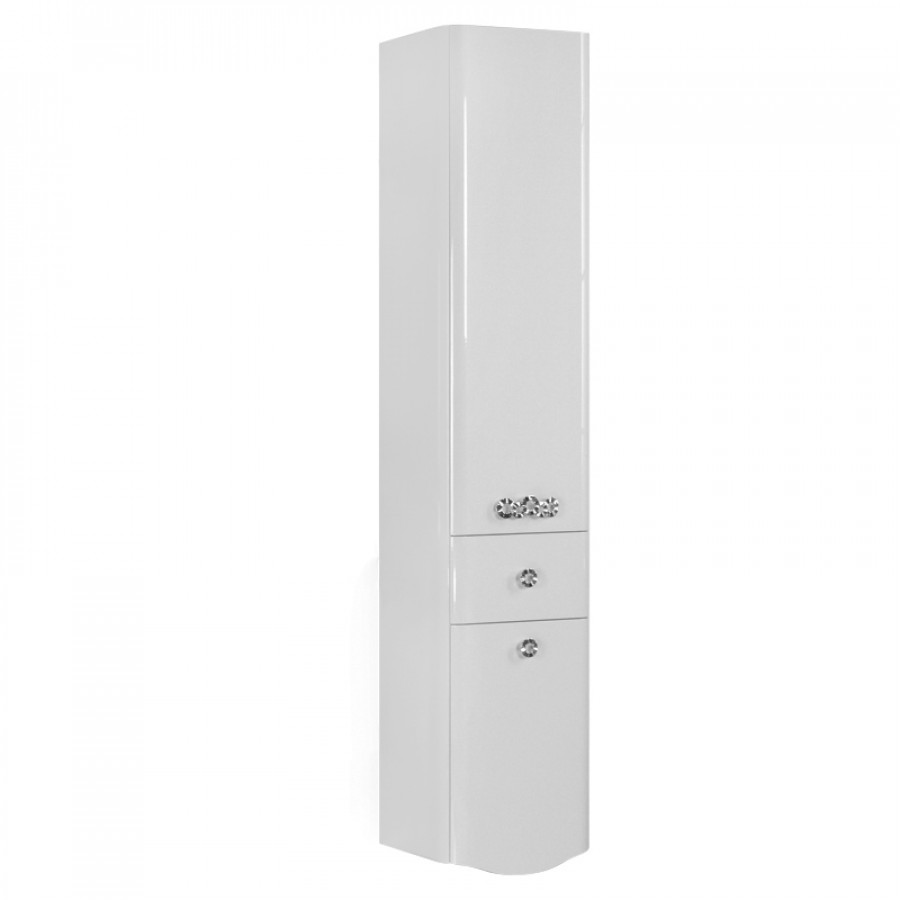 Подвесная шкаф-колонна Венеция выполнена в классическом стиле. Корпус выполнен из влагостойкой ЛДСП белого цвета, фасады выполнены из МДФ, покрытые белой глянцевой краской. В шкаф-колонне есть выдвижной ящик с двойными металлическими боковинами для хранения мелочей, а также фасад-створка, за которой скрываются полочки из просчетленного стекла на устойчивых полкодержателях. Направляющие с плавным, равномерным и бесшумным ходом полного выдвижения. Грузоподъемность до 40 кг на пару, гарантировано 80 000 циклов открываний и закрываний.