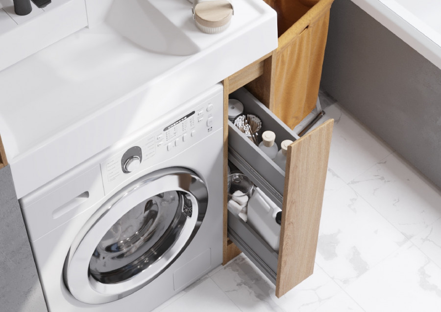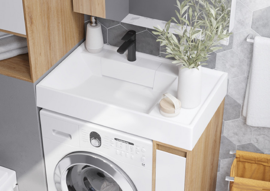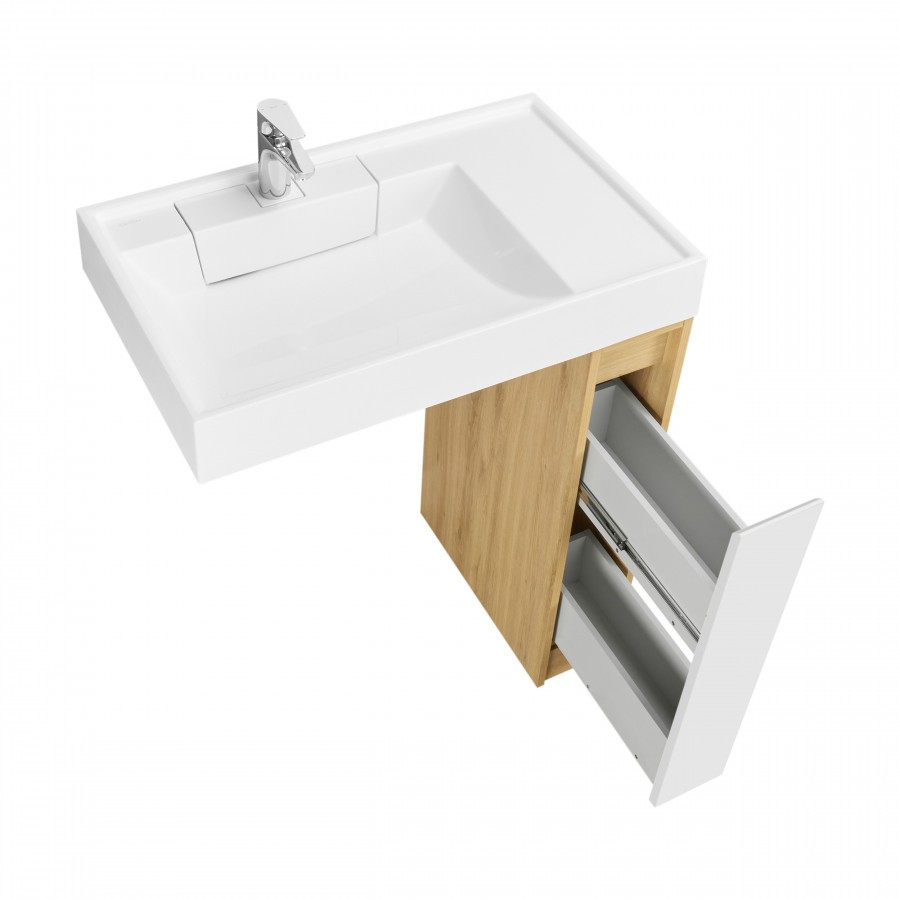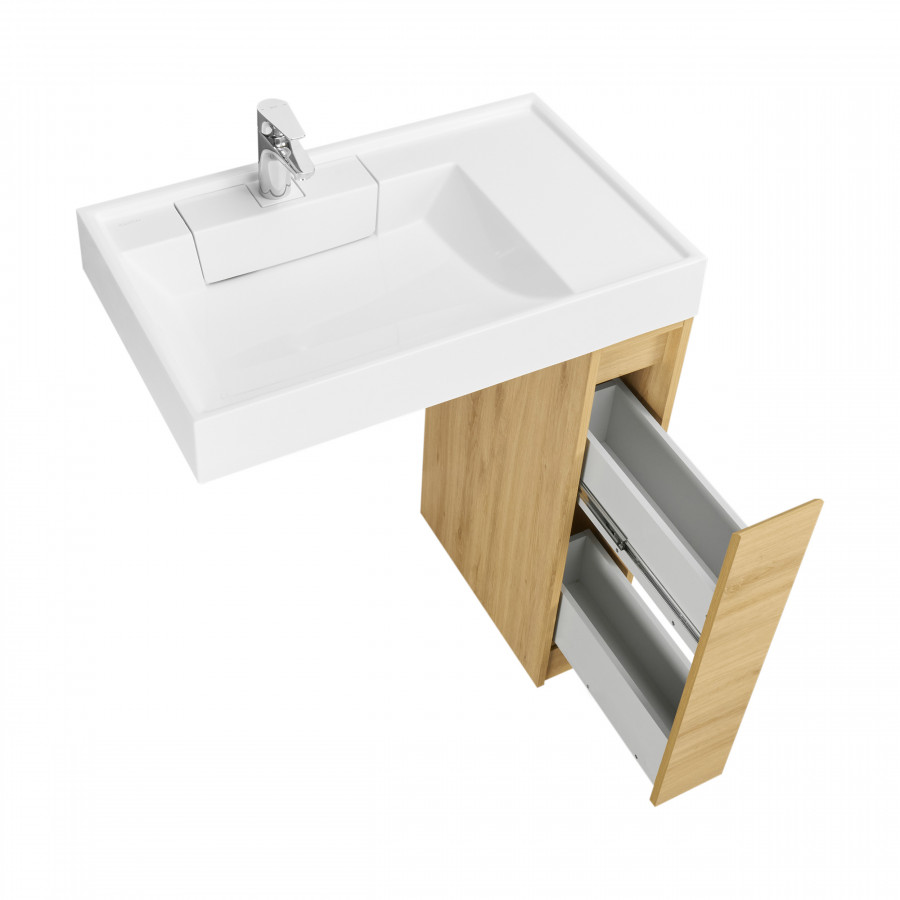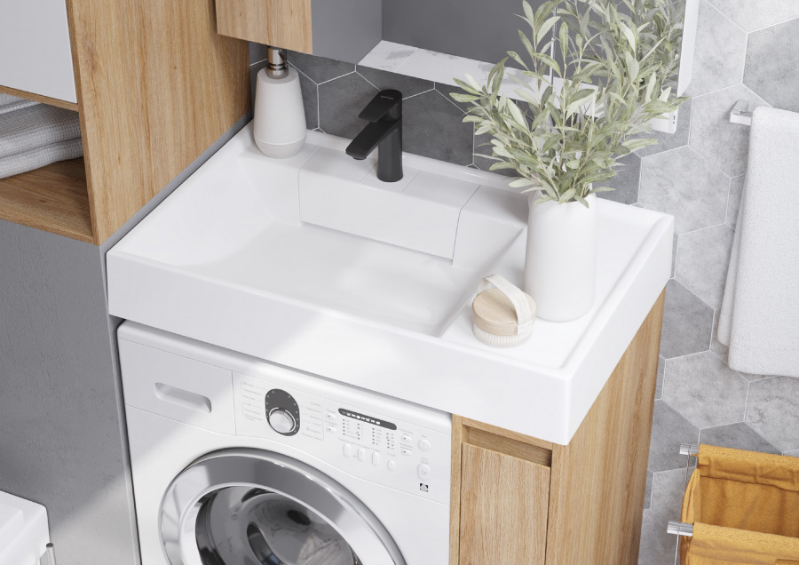 Тумба Лондри под стиральную машину выполнена из влагостойкой ламинированной плиты в древесной отделке. Фасад и раковина приобретаются отдельно. Тумбы комплектуются фасадами как с такой же древесной текстурой, так и в универсальном белом глянцевом цвете – это позволяет выбрать модель тумбы в соответствии с личными предпочтениями, создав наиболее удачное решение для конкретного интерьера ванной комнаты. Более того, при желании в одной тумбе можно совместить корпус и фасады в двух разных по оттенку древесных декорах. За фасадом тумбы скрывается удобная бутылочница. Открытие тумбы Лондри осуществляется за фасад благодаря эргономичному выпилу под углом. Ящик состоит из двух отделений: верхнего и нижнего. Каждое отделение ящика выдерживает нагрузку до 20 кг. Тумба комплектуется раковиной Рейн 80 из прочного литого мрамора. Компактный размер данного комплекта подойдет для небольших ванных комнат и обеспечит место для хранения необходимых предметов и аксессуаров. Дополнительно к тумбе можно приобрести шкаф-колонну Лондри и зеркальный шкаф Лондри 80.