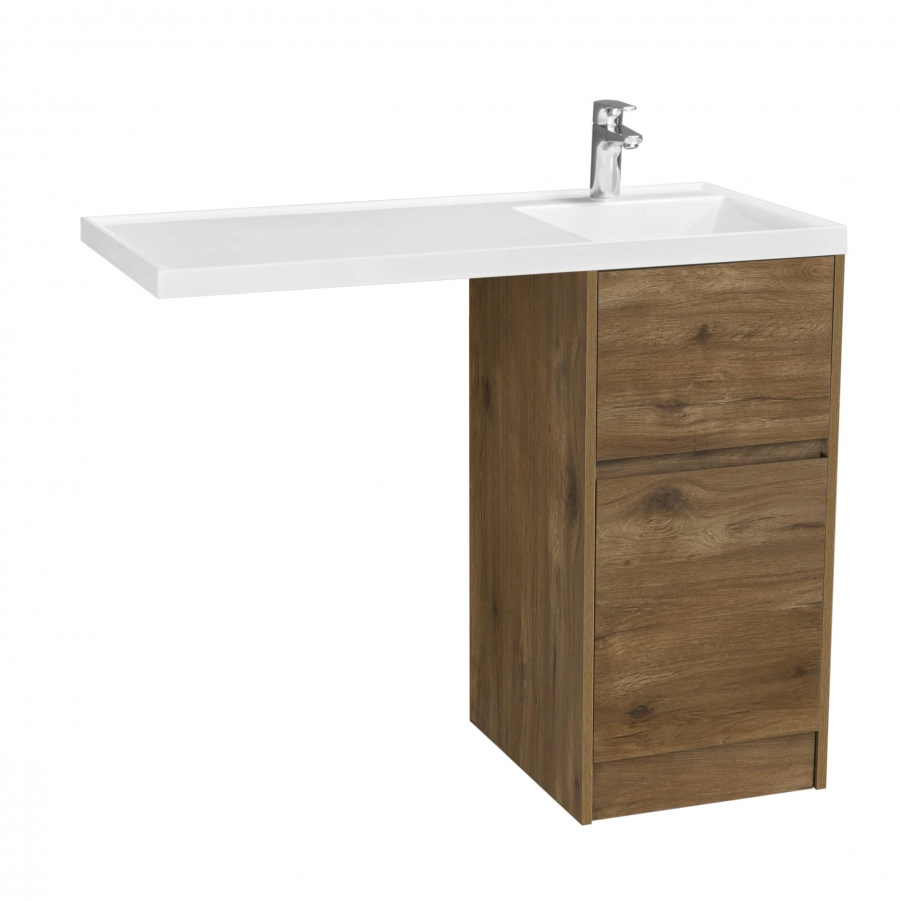 Тумба Лондри под стиральную машину выполнена из влагостойкой ламинированной плиты в древесной отделке. Фасад и раковина приобретаются отдельно. Тумбы комплектуются фасадами как с такой же древесной текстурой, так и в универсальном белом глянцевом цвете – это позволяет выбрать модель тумбы в соответствии с личными предпочтениями, создав наиболее удачное решение для конкретного интерьера ванной комнаты. Более того, при желании в одной тумбе можно совместить корпус и фасады в двух разных по оттенку древесных декорах. Верхний ящик открывается с помощью системы push-to-open, а нижний - за фасад с помощью удобного выпила под углом. Ящики выдерживают нагрузку до 25 кг. Тумба установлена на регулируемые опоры, которые находятся за цоколем. Тумба комплектуется раковиной Лондри 105 из прочного литого мрамора, который устойчив к воздействию химических средств. Широкое крыло раковины обеспечивает ванную комнату дополнительным функциональным пространством. Дополнительно к тумбе можно приобрести шкаф-колонну Лондри и зеркальный шкаф Лондри 100.