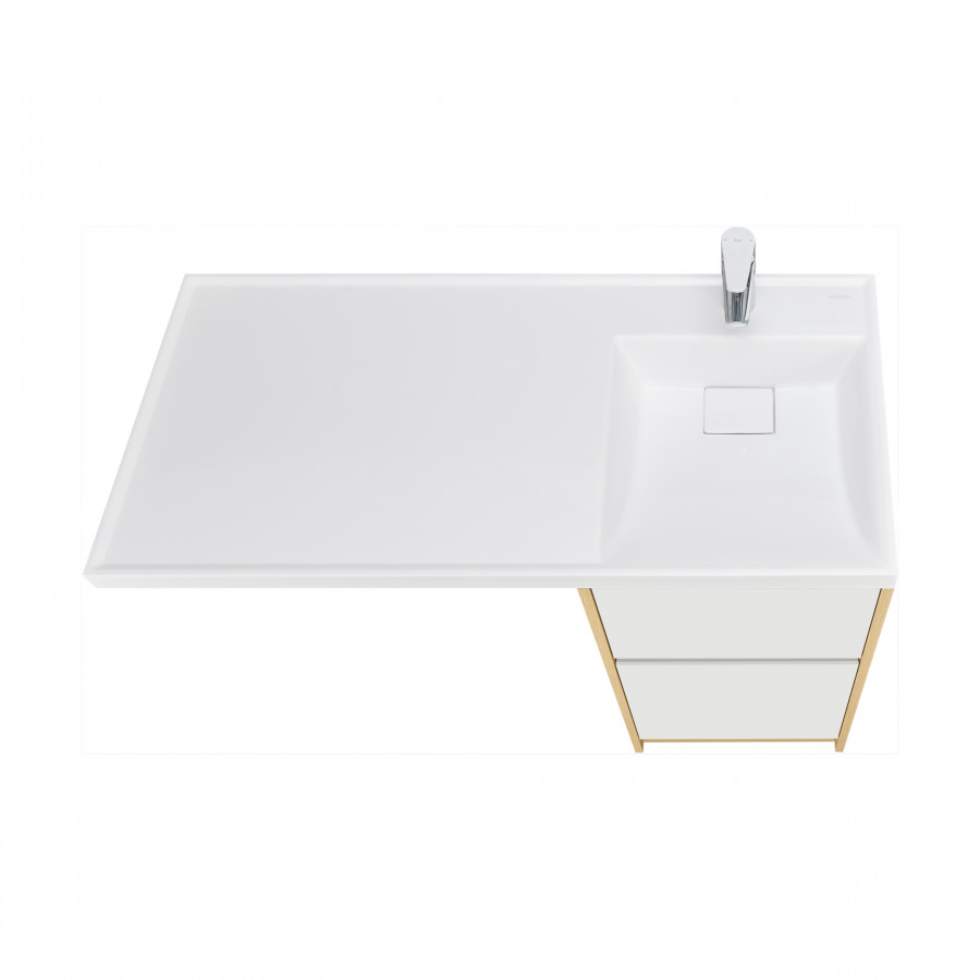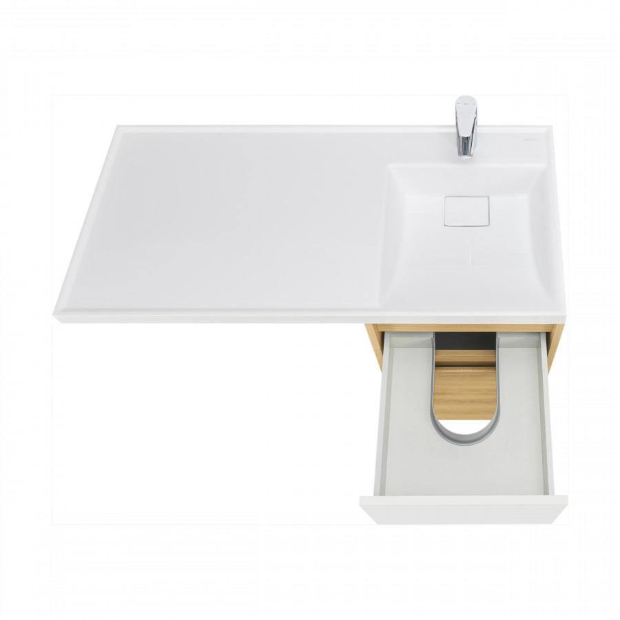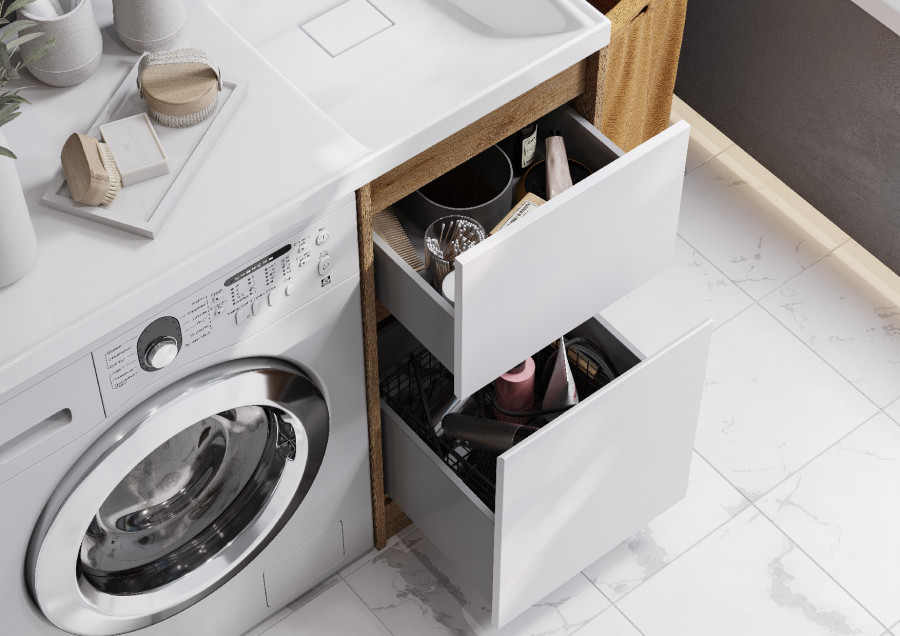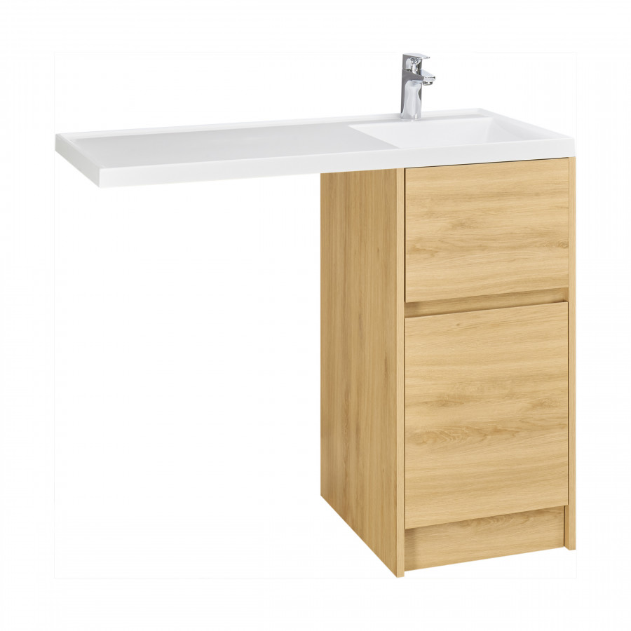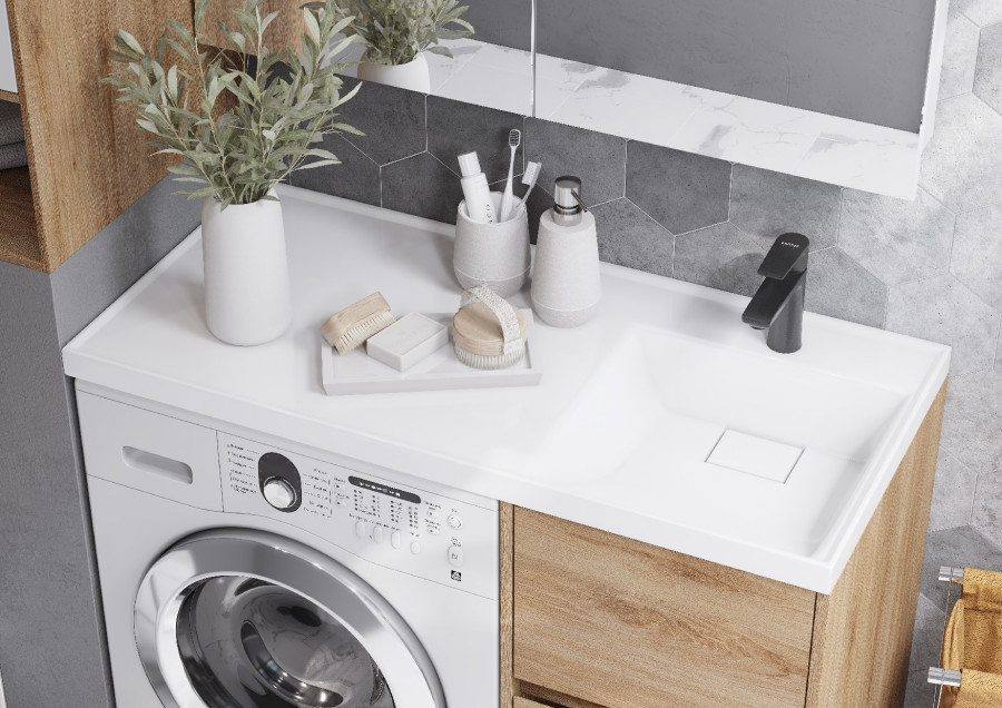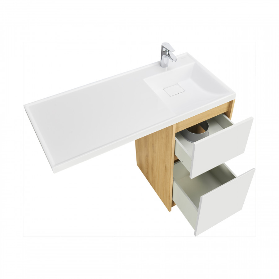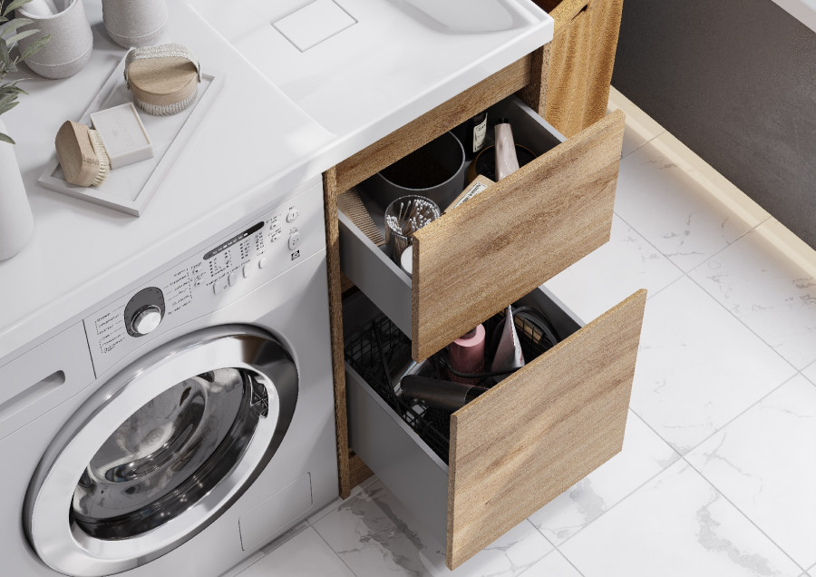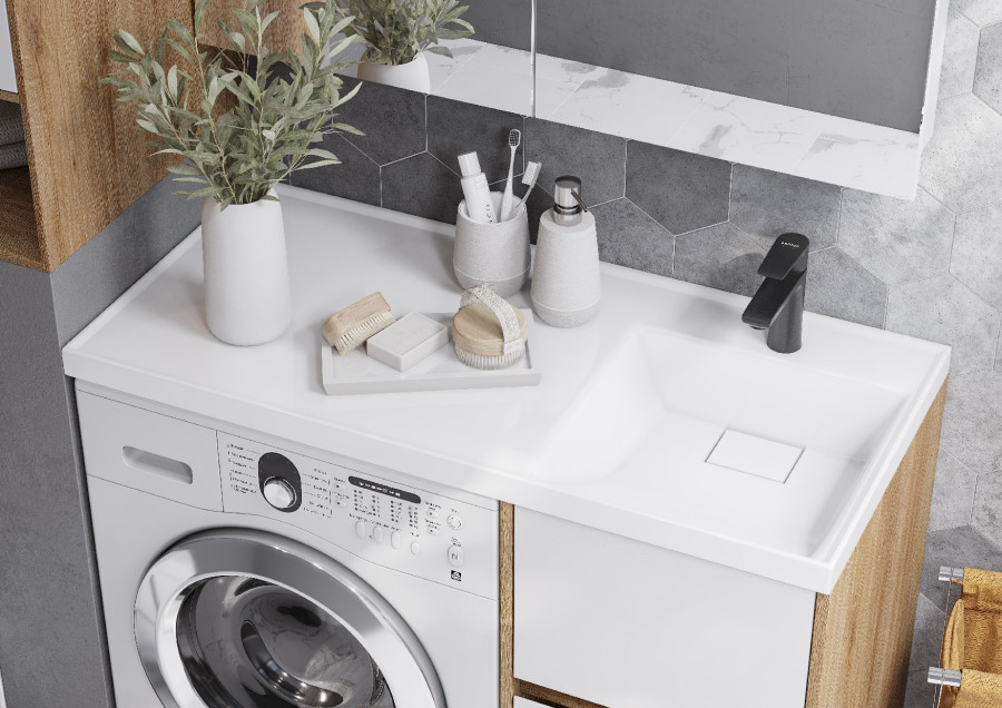 Тумба Лондри под стиральную машину выполнена из влагостойкой ламинированной плиты в древесной отделке. Фасад и раковина приобретаются отдельно. Тумбы комплектуются фасадами как с такой же древесной текстурой, так и в универсальном белом глянцевом цвете – это позволяет выбрать модель тумбы в соответствии с личными предпочтениями, создав наиболее удачное решение для конкретного интерьера ванной комнаты. Более того, при желании в одной тумбе можно совместить корпус и фасады в двух разных по оттенку древесных декорах. Верхний ящик открывается с помощью системы push-to-open, а нижний - за фасад с помощью удобного выпила под углом. Ящики выдерживают нагрузку до 25 кг. Тумба установлена на регулируемые опоры, которые находятся за цоколем. Тумба комплектуется раковиной Лондри 105 из прочного литого мрамора, который устойчив к воздействию химических средств. Широкое крыло раковины обеспечивает ванную комнату дополнительным функциональным пространством. Дополнительно к тумбе можно приобрести шкаф-колонну Лондри и зеркальный шкаф Лондри 100.