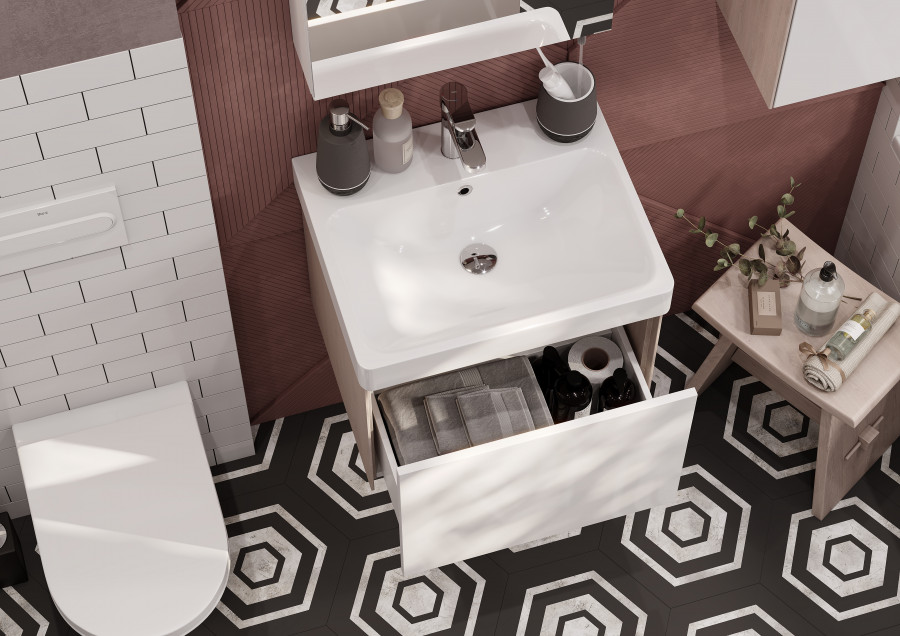 Белые фасады тумбы под раковину Асти 55 идеально сочетаются с боковыми стенками, выполненными в сдержанной древесной отделке Ясень Шимо Светлый: особенно органично она будет смотреться в интерьерах с отсылками к скандинавской эстетике. Сочетание цветов (белый глянец и ясень шимо) в коллекции АСТИ позволяет использовать мебель в современных интерьерах. Ящик тумбы оснащен механизмом Push-to-Open, гарантирующим плавное открывание и закрывание. Отличительная особенность мебели из коллекции - боковые стенки, при изготовлении которых используется особая инновационная технология. Благодаря ей создается эффект визуально тонких боковых линий, однако конструкция при этом остается надежной и прочной. Пространство для хранения в ящике тумбы можно организовать так, как удобно именно вам. Тумбы АСТИ комбинируются с раковиной Адриана бренда Santek.