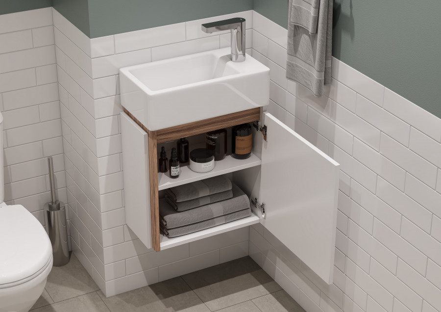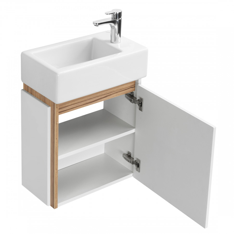 Правосторонняя тумба Эклипс М от AQUATON позволит грамотно организовать небольшой санузел или ванную комнату. Корпус у данной модели комбинированный и изготовлен из текстурированной ДСП в эффектной светлой отделке эбони и из влагостойкой ЛДСП, покрытой глянцевой белой краской. Фасад, выполненный из МДФ, также окрашен в белый глянец. Минималистичный дизайн тумбы подчеркивает отсутствие лицевой фурнитуры. Плавное закрывание распашного фасада-створки обеспечивают петли с доводчиком. Для комплектации тумбы Эклипс М подойдет компактная, но при этом глубокая прямоугольная керамическая раковина Santek Эрис 46. Расположение смесителя на раковине с правой стороны, петли на тумбе с правой стороны.