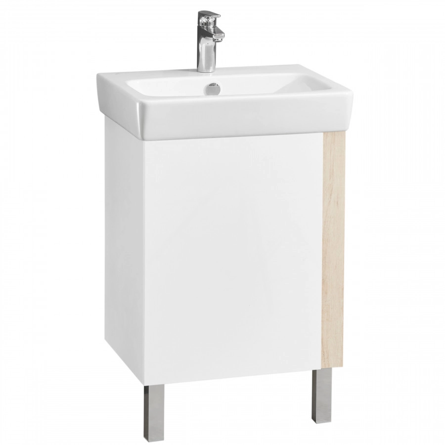 Лаконичная тумба Капри выполнена в современном дизайне: сочетание белого глянца (ВЛДСП в покраске) с древесным акцентом в цвете дуб верона (ламинированное влагостойкое ДСП). Все детали тумбы выполнены из влагостойкой ламинированной ДСП, предназначенной для использования в условиях ванной комнаты. Благодаря специальной обработке торца фасада под углом, открытие производится за створку. Универсальный функционал тумбы – распашная створка, за которой расположена полочка. Регулируемые опоры в комплекте.