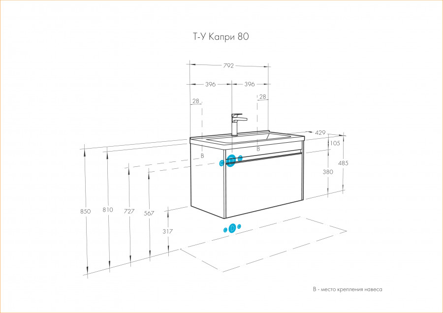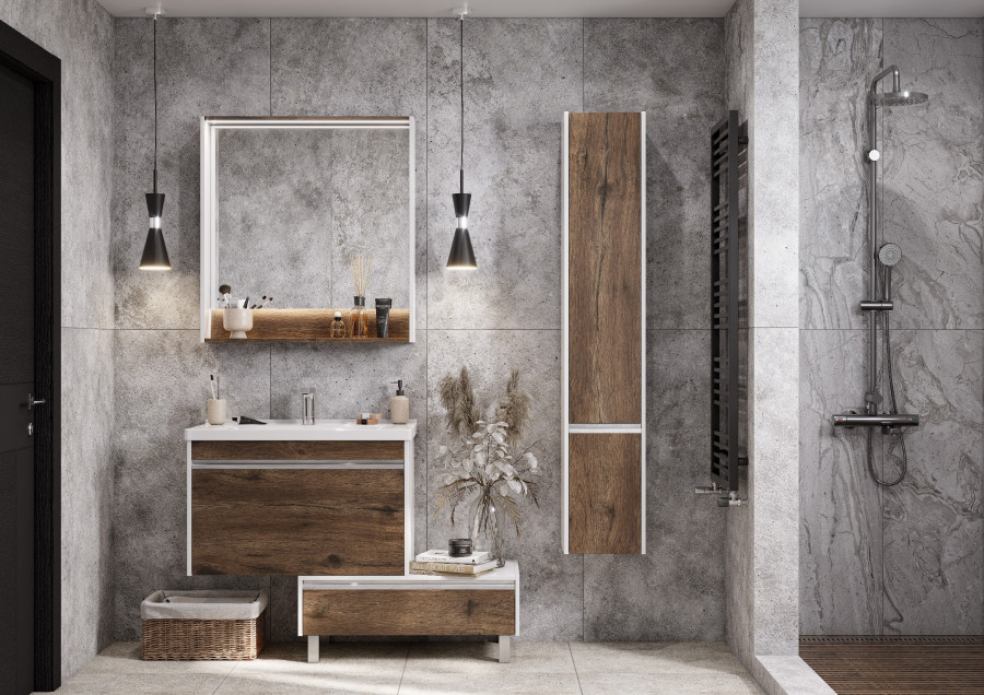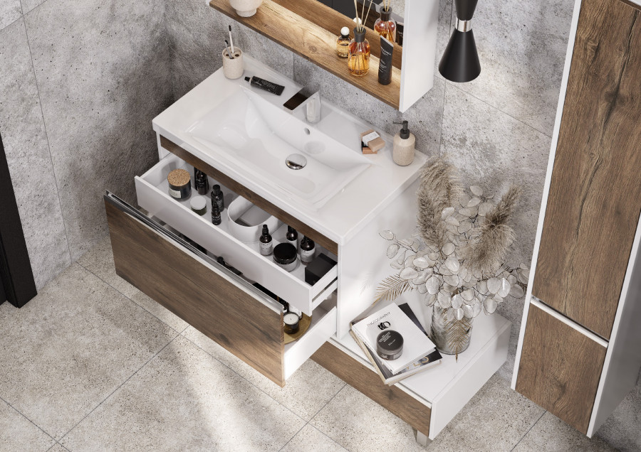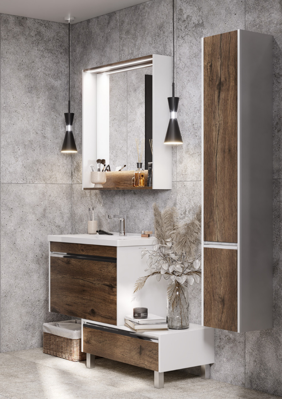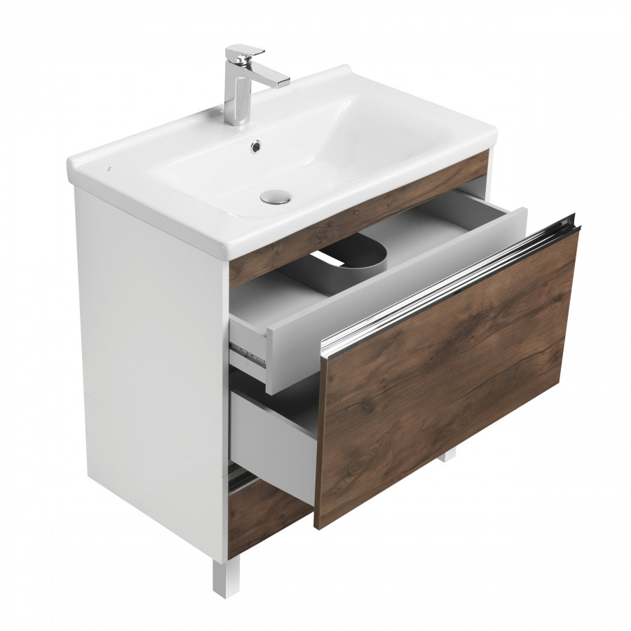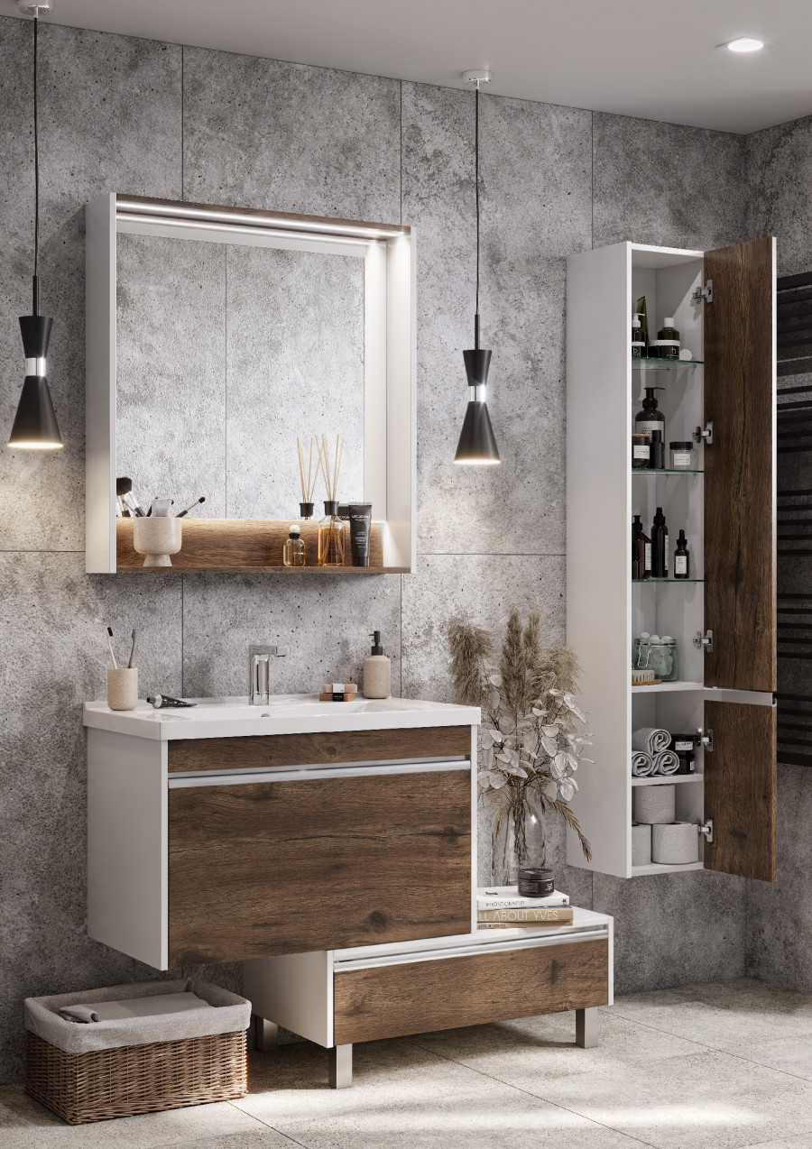 Стильная тумба под раковину Капри 80 от AQUATON отражает современные тенденции в дизайне мебели для ванных комнат: минимализм в чистом виде с простыми и понятными формами, отсутствие лишних деталей, удобные профильные ручки, интегрированные в фасад. Корпус выполнен из влагостойкой ЛДСП и покрыт белой глянцевой краской, фасады также изготовлены из влагостойкой ЛДСП в эффектной декоративной отделке тёмная таксония. Тумба предлагает удобную систему хранения, что особенно актуально для тех, кто ценит порядок во всем. Модель оборудована двумя вместительными ящиками. Комфорт и удобство при использовании гарантируют направляющие с доводчиками и интегрированная система плавного закрывания. В качестве дополнения к подвесной тумбе предлагается дополнительный комод на ножках, который может быть установлен как непосредственно под тумбой, так и со смещением влево или вправо.