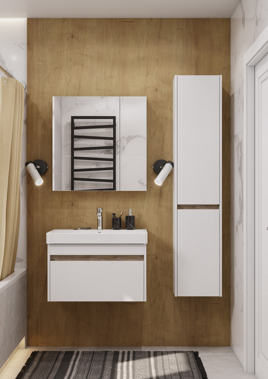 Тумба МАРТИ 70 отличается вместительностью и удобством в использовании: при желании в ящике можно организовать хранение не только шампуней и кремов, но и, например, полотенец. При этом тумба МАРТИ смотрится интересно благодаря выпилу на фасаде, который позволяет открывать тумбу за фасад: в углублении видна контрастная вставка в древесной отделке. Эта акцентная деталь придает модели графичность и позволяет подчеркнуть правильные пропорции тумбы. Корпус и боковые стенки изготовлены из влагостойкой ламинированной ДСП, окрашенной в белый цвет специальной краской ультрафиолетового отверждения для защиты мебели от влаги в условиях ванной комнаты. Декоративная вставка в цвете дуб эндгрейн.