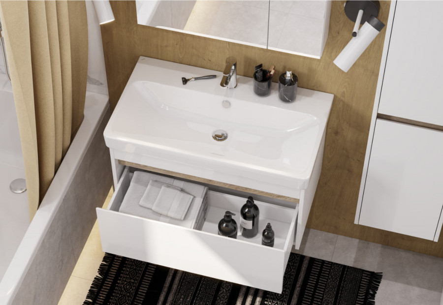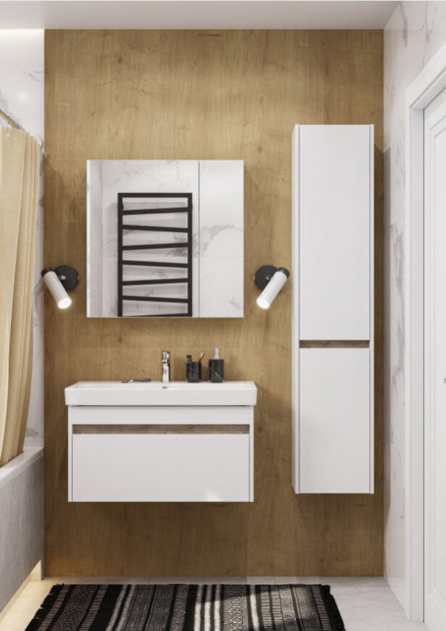 Тумба МАРТИ 80 отличается вместительностью и удобством в использовании: при желании в ящике можно организовать хранение не только шампуней и кремов, но и, например, полотенец. При этом тумба МАРТИ смотрится интересно благодаря выпилу на фасаде, который позволяет открывать тумбу за фасад: в углублении видна контрастная вставка в древесной отделке. Эта акцентная деталь придает модели графичность и позволяет подчеркнуть правильные пропорции тумбы. Корпус и боковые стенки изготовлены из влагостойкой ламинированной ДСП, окрашенной в белый цвет специальной краской ультрафиолетового отверждения для защиты мебели от влаги в условиях ванной комнаты. Декоративная вставка в цвете дуб эндгрейн.