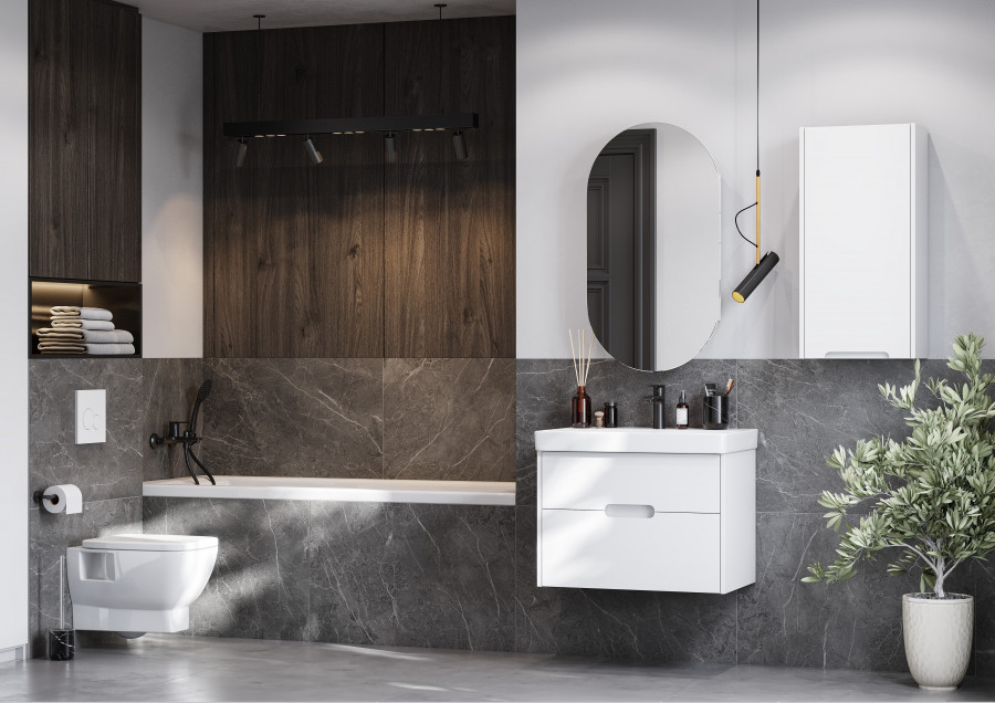 Корпус тумбы Оливия изготовлен из влагостойкой ламинированной ДСП в белой матовой покраске, а фасады ящиков в пленке от европейского производителя надежно защитят мебель от воздействия влаги в условиях ванной комнаты. Ящики установлены на направляющие полного выдвижения с доводчиками, что обеспечит легкий доступ ко всем предметам, которые хранятся в ящиках. Корпус и внутренние детали ящиков выполнены в единой цветовой гамме. Необычный вырез на фасадах создает имитацию ручки: оригинальный дизайн тумбы без выступающих деталей и комфортное использование. Размер ручки 18 см. К тумбе отлично подходит удобная современная керамическая раковина Адриана от бренда Santek.