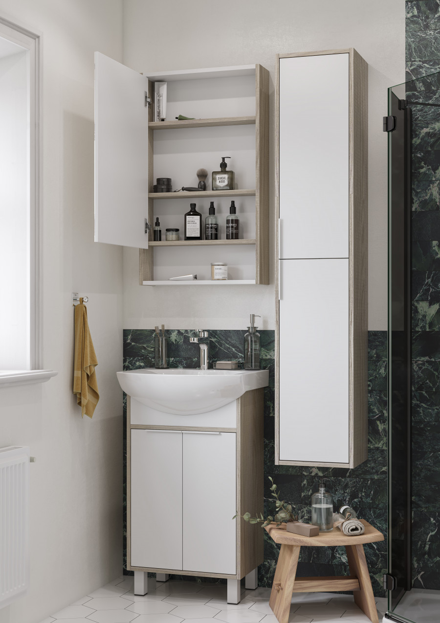 Для небольших пространств есть один универсальный рецепт создания гармоничного интерьера: простота и минимум сложных деталей. Компактная тумба Рико 50 от AQUATON в комбинированной отделке - идеальное решение для ванных комнат со скромными габаритами. Корпус тумбы изготовлен из влагостойкой ЛДСП в декоративной отделке под натуральное дерево оттенка ясень фабрик. Фасады выполнены из высококачественной МДФ и покрыты белой глянцевой краской. Внутри тумбы за распашным фасадом находится регулируемая по высоте полка. Удобство при открывании и закрывании обеспечивают надежные петли с доводчиками.