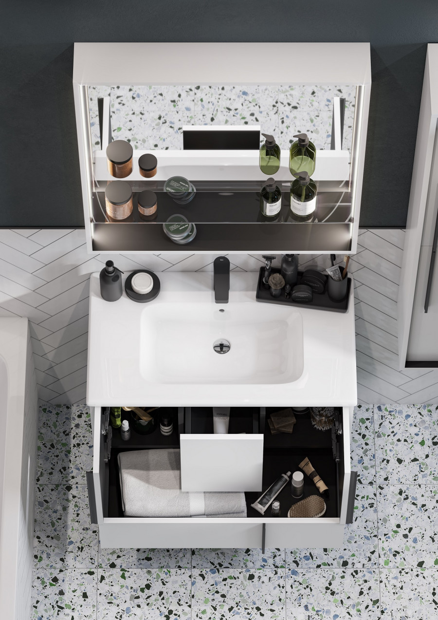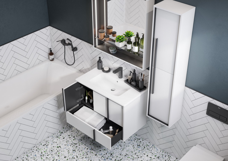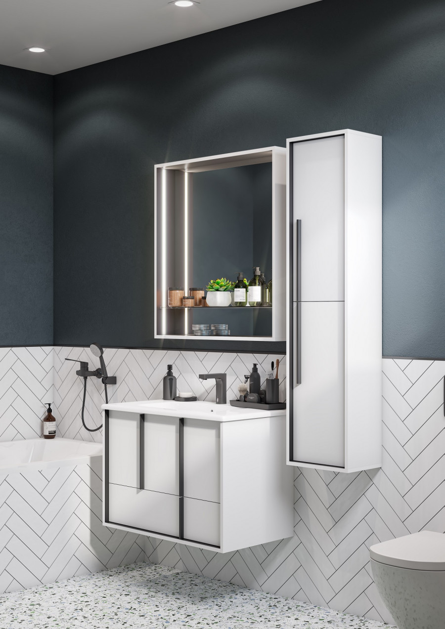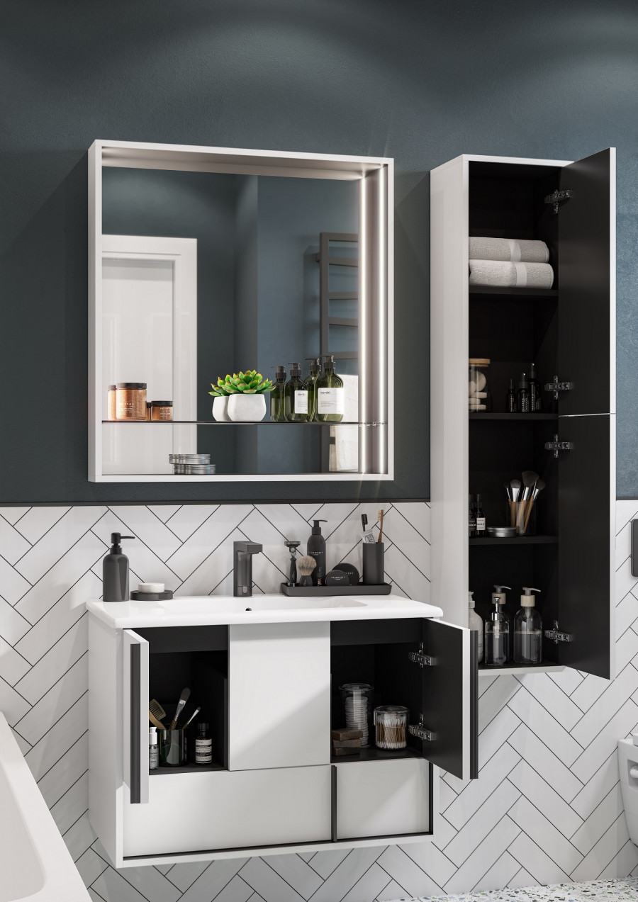 Эффектное классическое сочетание чёрного и белого - лаконичная и всегда беспроигрышная комбинация. Тумба Ривьера 80 выполнена из МДФ чёрного цвета и покрыта белой матовой пленкой, что позволяет создать яркий контраст. Пленка позволяет надежно защитить мебель от воздействия влажной среды ванной комнаты. Центральный ящик тумбы оснащен системой push-to-open, слева и справа за распашными фасадами удобные ниши и вместительный нижний ящик позволит удобно расположить косметические и моющие средства. Необычные чёрные матовые ручки комфортны в использовании и подчеркивают чёткую геометрию линий. Комфорт при использовании обеспечивают надежные петли с доводчиками и направляющие с системой плавного закрывания. Дополнит комплект керамическая раковина Victoria Unik от бренда Roca.