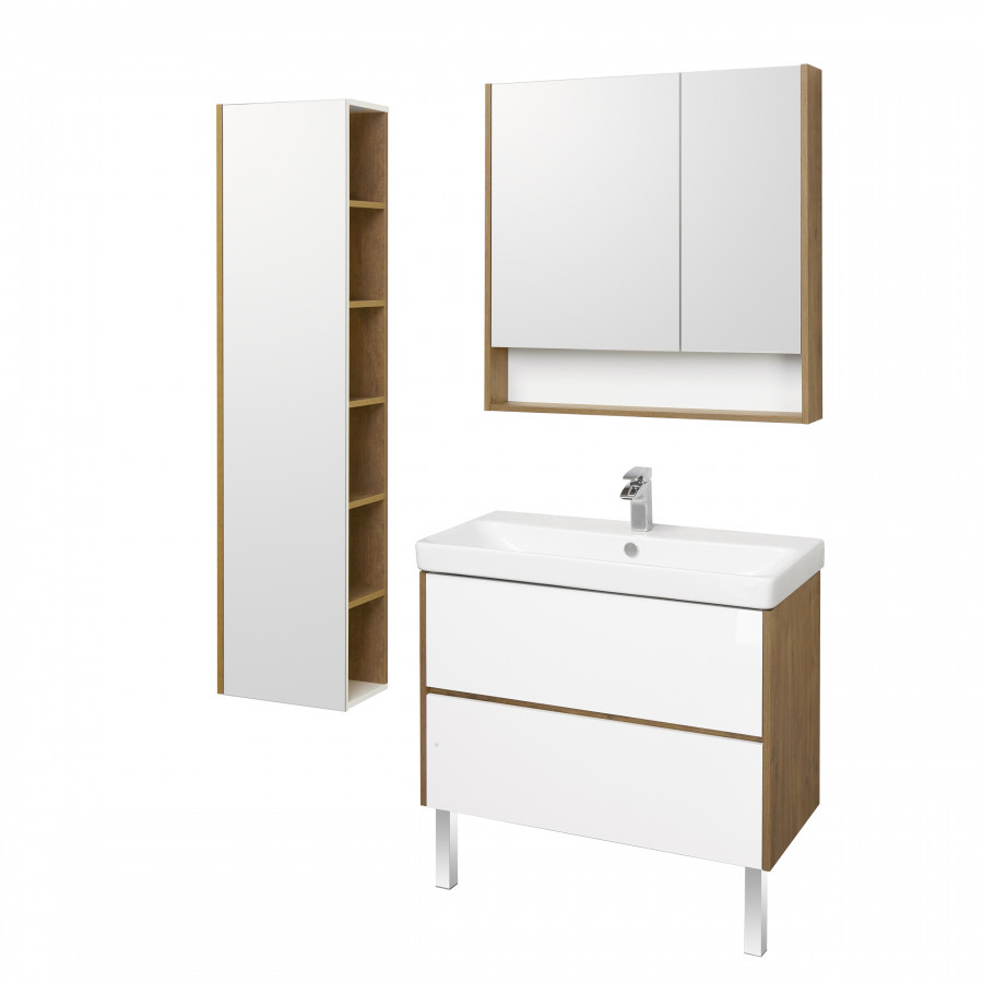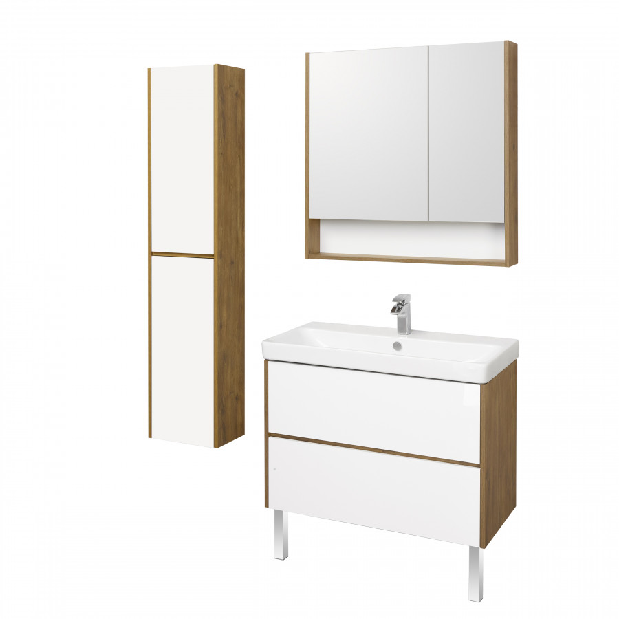 Тумба Сканди 90 выполнена в популярном минималистичном скандинавском стиле. Корпус тумбы выполнен из влагостойкой ЛДСП в декоре натурального дерева, а фасады в белой глянцевой покраске. Конструктивно тумба состоит из 2 вместительных ящиков, установленных на направляющие с интегрированной системой push-to-open для комфортного использования. На тумбе нет выступающих деталей и фурнитуры, открытие ящиков реализовано нажатием на фасад. К тумбе идеально подходит белоснежная раковина Адриана от бренда Santek. Раковина продается отдельно. Тумбу по желанию можно использовать в двух вариантах: как подвесную или дополнительно приобрести опоры