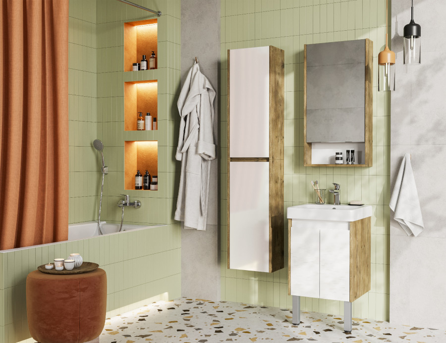 Тумба Сканди Doors 45 выполнена в популярном минималистичном скандинавском стиле. Корпус тумбы выполнен из влагостойкой ЛДСП в декоре натурального дерева, а фасады-створки в белой глянцевой покраске. За створками скрывается вместительное пространство, разделенное на две части регулируемой по высоте полкой из ВЛДСП. На тумбе нет выступающих деталей и фурнитуры, открытие створок реализуется за фасад, верхняя часть которого обработана под ручку J-профиль. К тумбе идеально подходит белоснежная раковина Адриана от бренда Santek. Раковина продается отдельно.