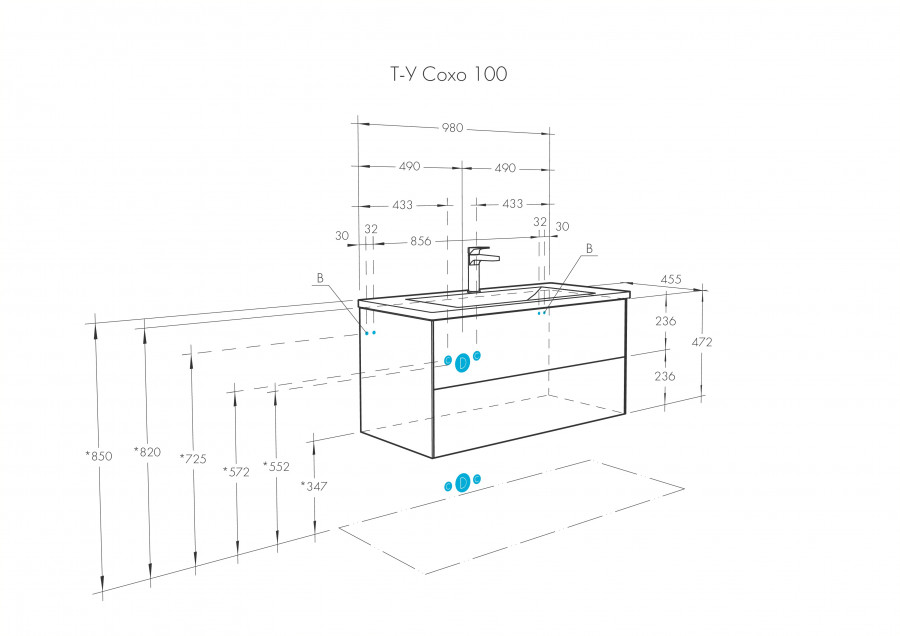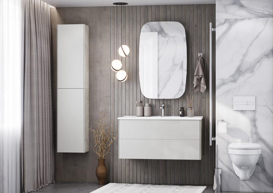 Тумба Сохо 100 функционально состоит из двух вместительных ящиков, оснащенных системой push to open, обеспечивающей надежное, комфортное и бесшумное закрывание. Фасады изделия выполнены из МДФ в пленке в цвете галька серая, корпус из ламинированной влагостойкой ДСП слэйт. Верхний и нижний ящики оснащены системой организации пространства, которая позволяет содержать косметические средства в идеальном порядке. Дополняет тумбу стильная раковина Элина от бренда Santek с удобной чашей. Все внутренние детали тумбы выполнены в цвете антрацит.