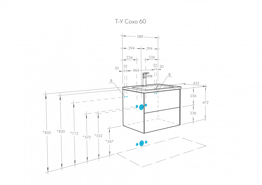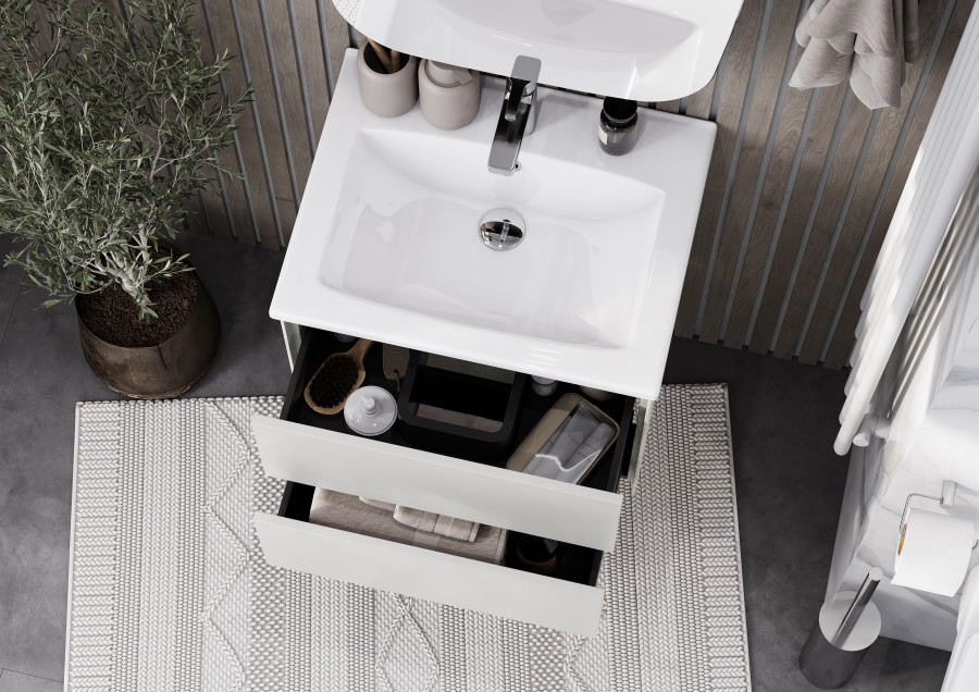 Тумба Сохо 60 функционально состоит из двух вместительных ящиков, оснащенных системой push to open, обеспечивающей надежное, комфортное и бесшумное закрывание. Фасады изделия выполнены из МДФ в пленке в цвете галька серая, корпус из ламинированной влагостойкой ДСП слэйт. Верхний и нижний ящики позволяют содержать косметические средства в идеальном порядке. Дополняет тумбу стильная раковина Элина от бренда Santek с удобной чашей. Все внутренние детали тумбы выполнены в цвете антрацит.