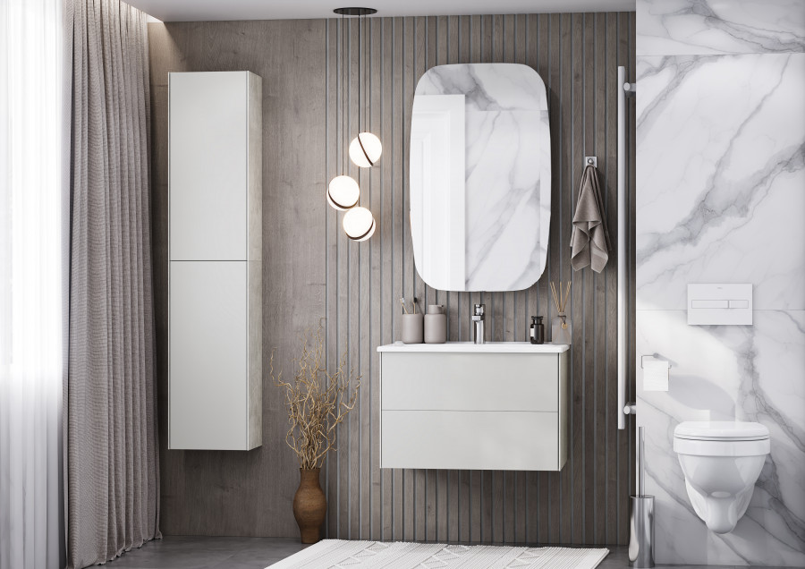 Тумба Сохо 75 функционально состоит из двух вместительных ящиков, оснащенных системой push to open, обеспечивающей надежное, комфортное и бесшумное закрывание. Фасады изделия выполнены из МДФ в пленке в цвете галька серая, корпус из ламинированной влагостойкой ДСП слэйт. Верхний и нижний ящики оснащены системой организации пространства, которая позволяет содержать косметические средства в идеальном порядке. Дополняет тумбу стильная раковина Элина от бренда Santek с удобной чашей. Все внутренние детали тумбы выполнены в цвете антрацит.