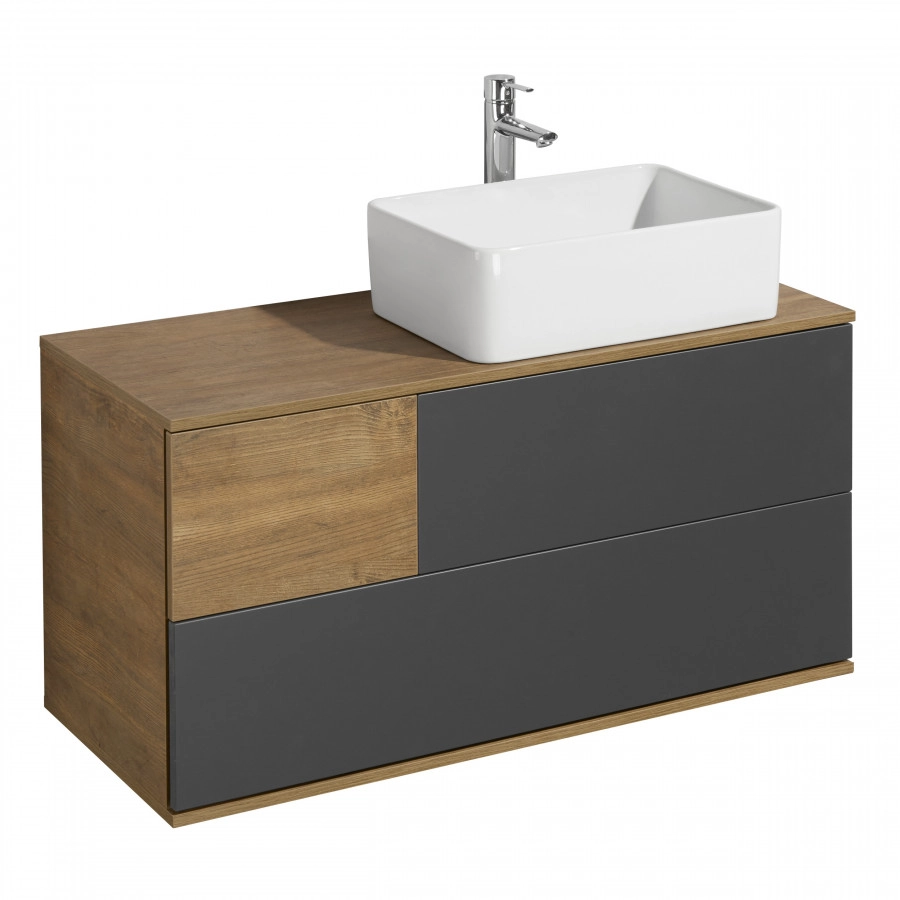 Коллекция Терра сочетает стильные оттенки: дуб кантри и антрацит. Текстуры на тумбе Терра 105 расположены ассиметрично: столешница, корпус и вставка на верхнем ящике - влагостойкое ДСП с текстурой дуб кантри, фасады ящиков - матовая серая пленка антрацит. Тумба умывальник состоит из двух вместительных ящиков, открывающихся с помощью системы push-to-open, нижний ящик комплектуется системой организации пространства, которая препятствует смещению мелких косметических и гигиенических средств.