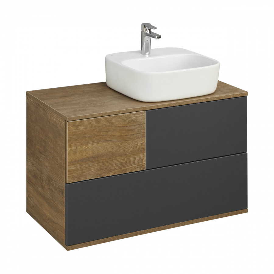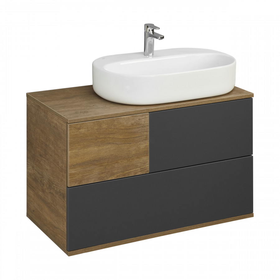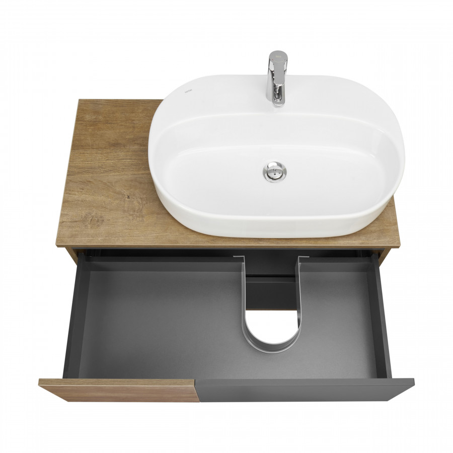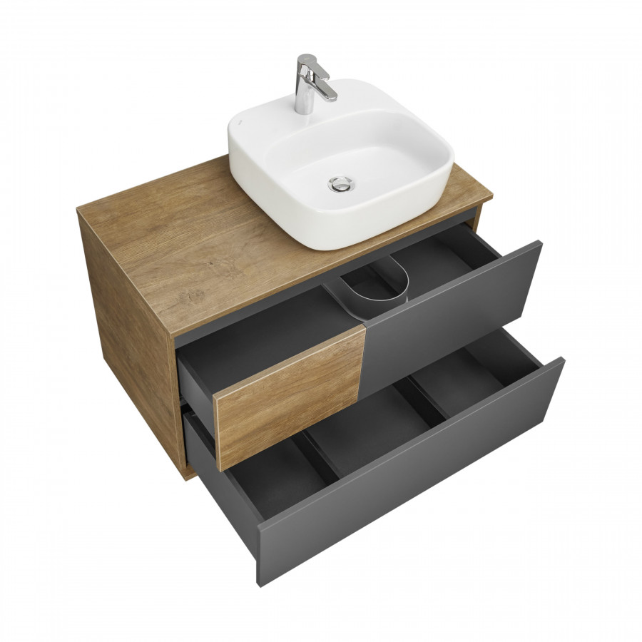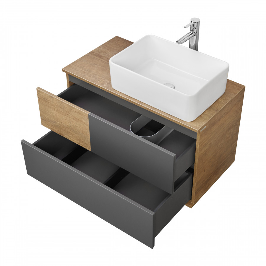 Мебель коллекции Терра сочетает в себе стильные оттенки: дуб кантри и антрацит. Тумба Терра 85 состоит из двух вместительных ящиков, открывающихся с помощью системы push-to-open, нижний ящик комплектуется системой организации пространства, которая препятствует смещению мелких косметических и гигиенических средств. Фасады ящиков - матовая серая пленка антрацит, а столешница, корпус и вставка на верхнем ящике - влагостойкое ДСП с текстурой дуб кантри.