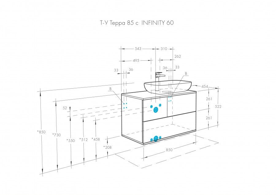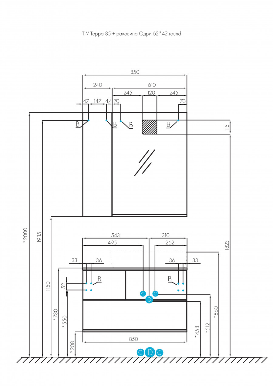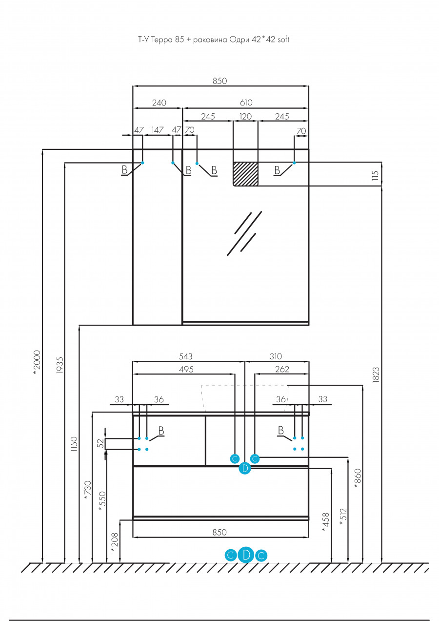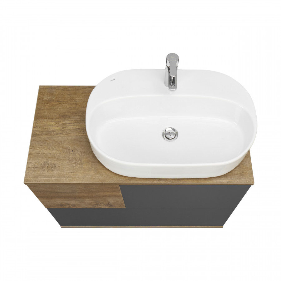 Мебель коллекции Терра сочетает в себе стильные оттенки: дуб кантри и антрацит. Тумба Терра 85 состоит из двух вместительных ящиков, открывающихся с помощью системы push-to-open, нижний ящик комплектуется системой организации пространства, которая препятствует смещению мелких косметических и гигиенических средств. Фасады ящиков - матовая серая пленка антрацит, а столешница, корпус и вставка на верхнем ящике - влагостойкое ДСП с текстурой дуб кантри.