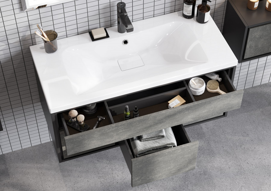 Подвесная тумба Уэльс в стиле лофт создана для истинных ценителей индустриального шика. Благородный цвет фасадов под серый бетон в сочетании с корпусом из глубокого темно-серого оттенка придаёт модели актуальное звучание, отражая эстетику современной роскоши. У данной модели двойной корпус, который выполнен из влагостойкой ЛДСП и высококачественной МДФ, покрытой матовой пленкой. Фасады также выполнены из МДФ и покрыты матовой пленкой. Отсутствие лицевой фурнитуры подчеркивает сдержанный лаконичный дизайн модели. Тумба предлагает оптимальную систему организации пространства: два вместительных ящика, верхний и центральный, выдвигаются простым нажатием благодаря удобной системе push-to-open, а справа и слева за фасадами-створками скрыты дополнительные отсеки для хранения.
