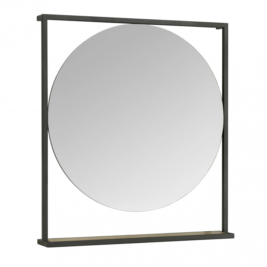Зеркало Лофт Фабрик в размере 80 отличается необычным оригинальным дизайном и удобным функционалом. Черные металлические профили обрамляют круглое зеркало, под которым находится полочка из влагостойкой ламинированной плиты в цвете Дуб Кантри. Открытая полочка удобна для косметических и декоративных мелочей, которые всегда должны быть под рукой.