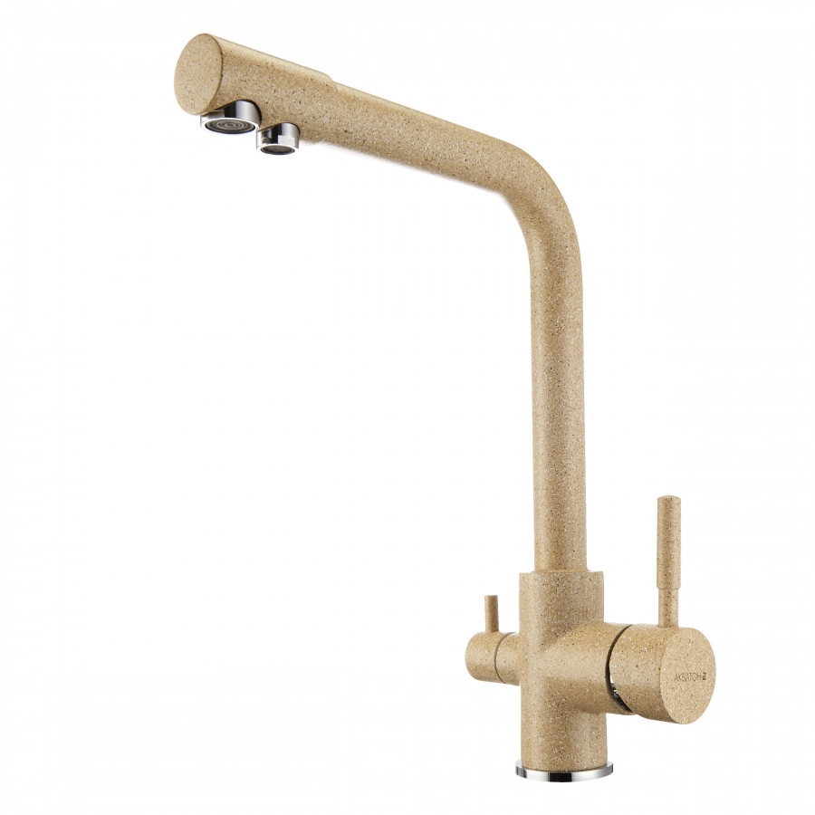 Смеситель Руан для кухонной мойки от компании Акватон. Подключение к фильтру пиьевой воды. Совмещенный излив. Цвет смесителя специально подобран в соответствии с цветом кухонных моек Акватон из литьевого камня. Корпус смесителя выполнен из латуни, что гарантирует долгий срок эксплуатации изделия, сопротивление коррозии и безопасность для человека. Декоративное цветное покрытие отличается высокой силой сцепления с поверхностью смесителя, обеспечивая устойчивость к царапинам и сколам.