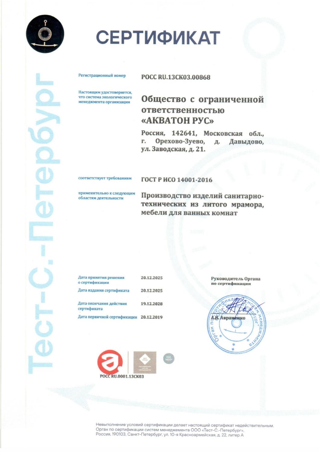 Сертификат соответствия ГОСТ Р ИСО 14001-2016